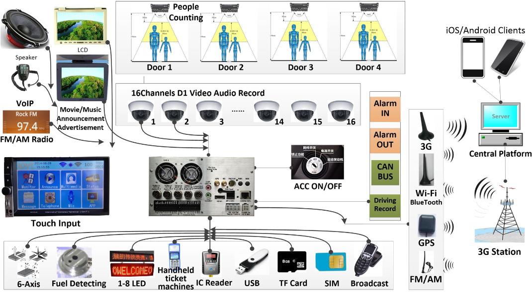 | Wi-Fi | Built-in Wi-Fi module, support for 802.11 a/b/g/n, dual-band 2.4GHz, supports WDS wireless repeater. Support for Wi-Fi hotspots, 254 passengers can connect mobile phones / laptops and other wireless terminals Can be connected to Wi-Fi handheld ticket machines |