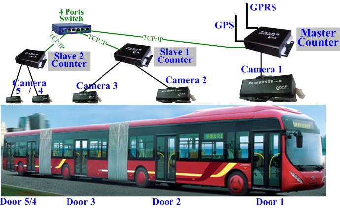 Each counter can connect to one or two StereoCameras to inspect front and rear doors’ channel respectively. Or connect multiple StereoCameras with counters, you can detect 1.2 m-10 m channel. If three or more of the doors of the car, you can have multiple counters and multiple StereoCameras wired up, and may share a common GPS/GPRS module or serial port to transfer the data.